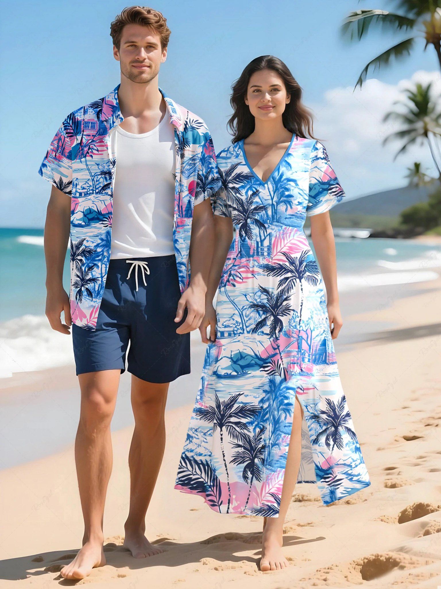 Coconut Tree Tropical Leaf Print Plus Size Matching Hawaii Beach Outfit For Couples