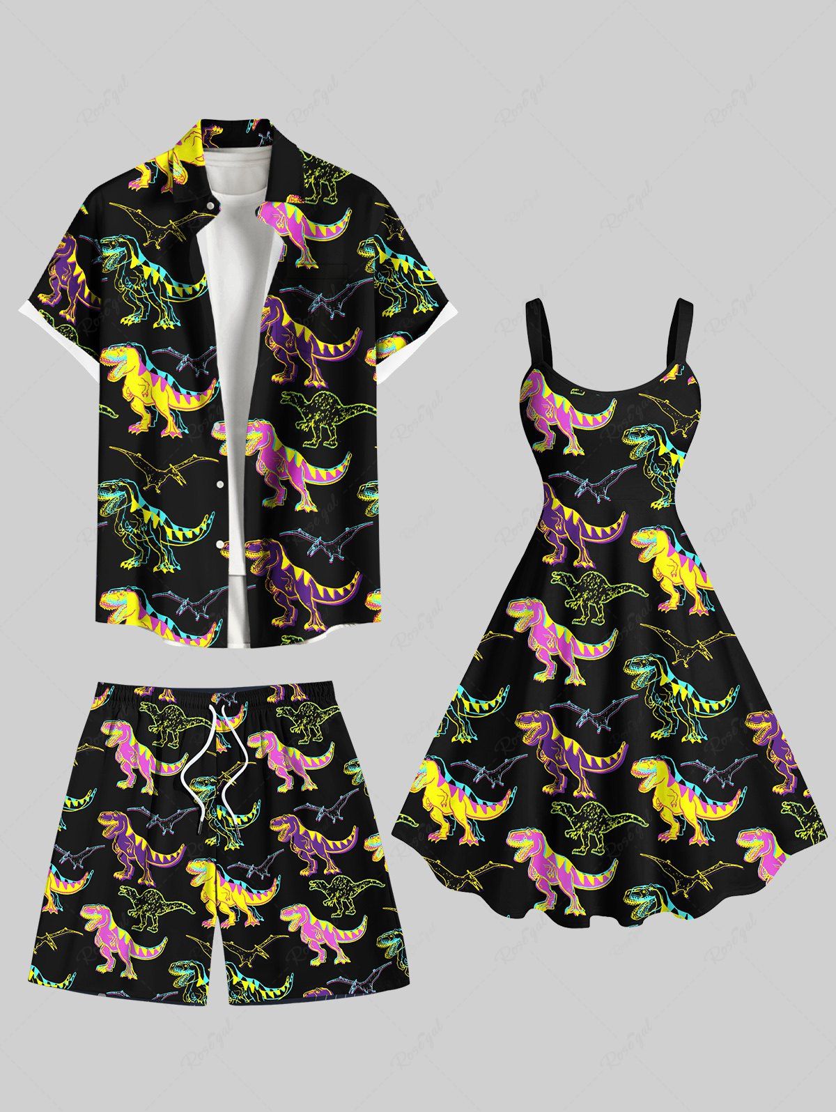 Colorful Dinosaur Print Plus Size Matching Hawaii Beach Outfit For Couples