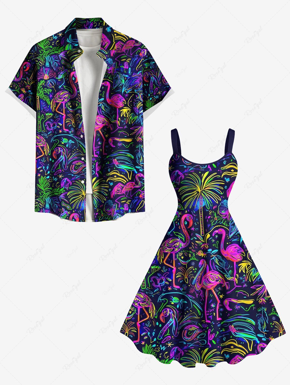 Colorful Flamingo Coconut Tree Print Plus Size Matching Hawaii Beach Outfit For Couples