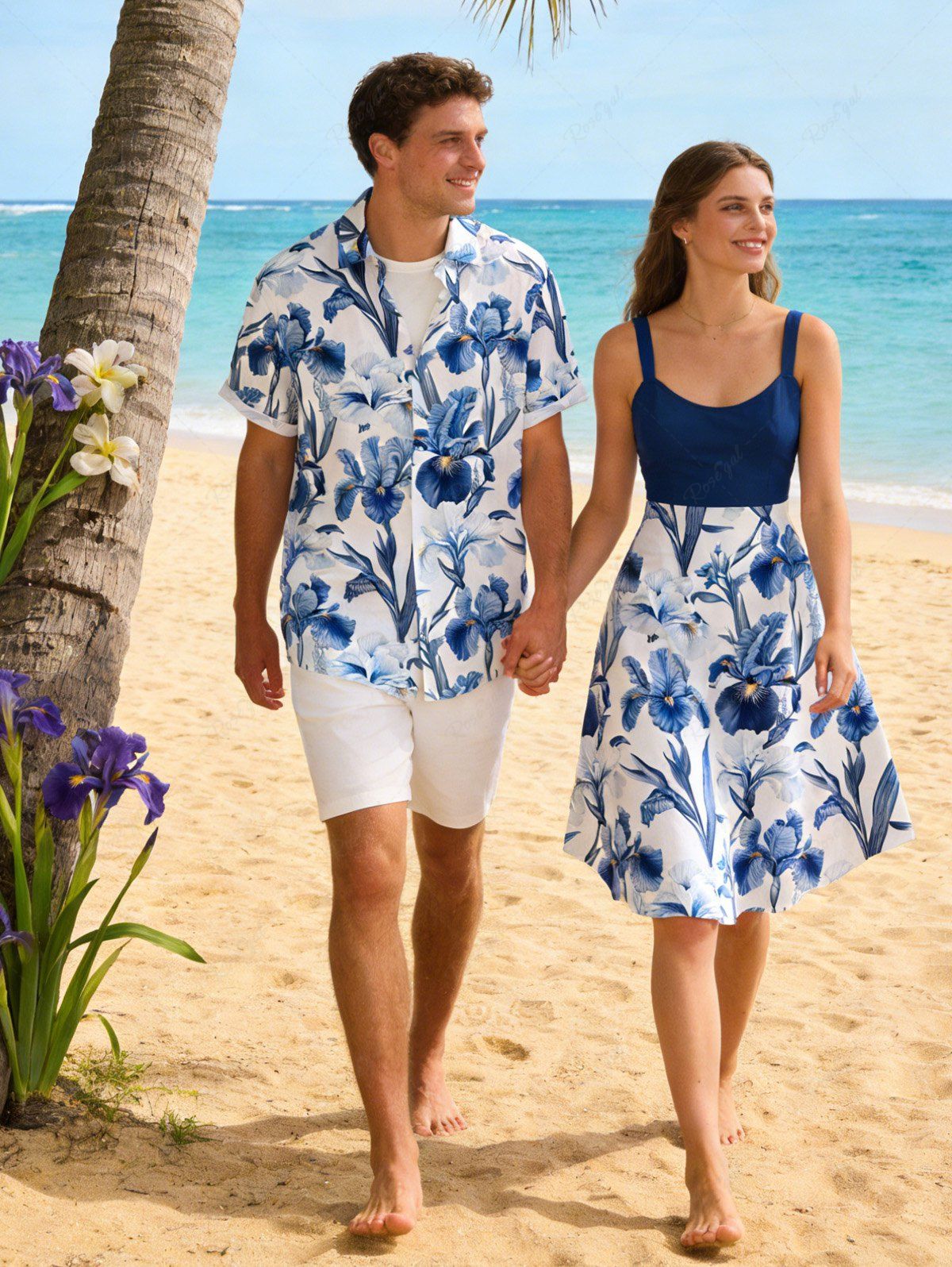 Floral Leaves Branch Print Plus Size Matching Hawaii Beach Outfit For Couples