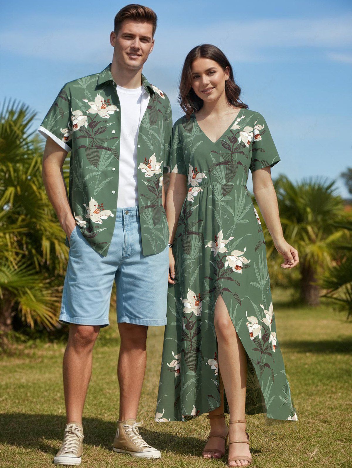 Flower Leaf Plant Print Plus Size Matching Hawaii Beach Outfit For Couples