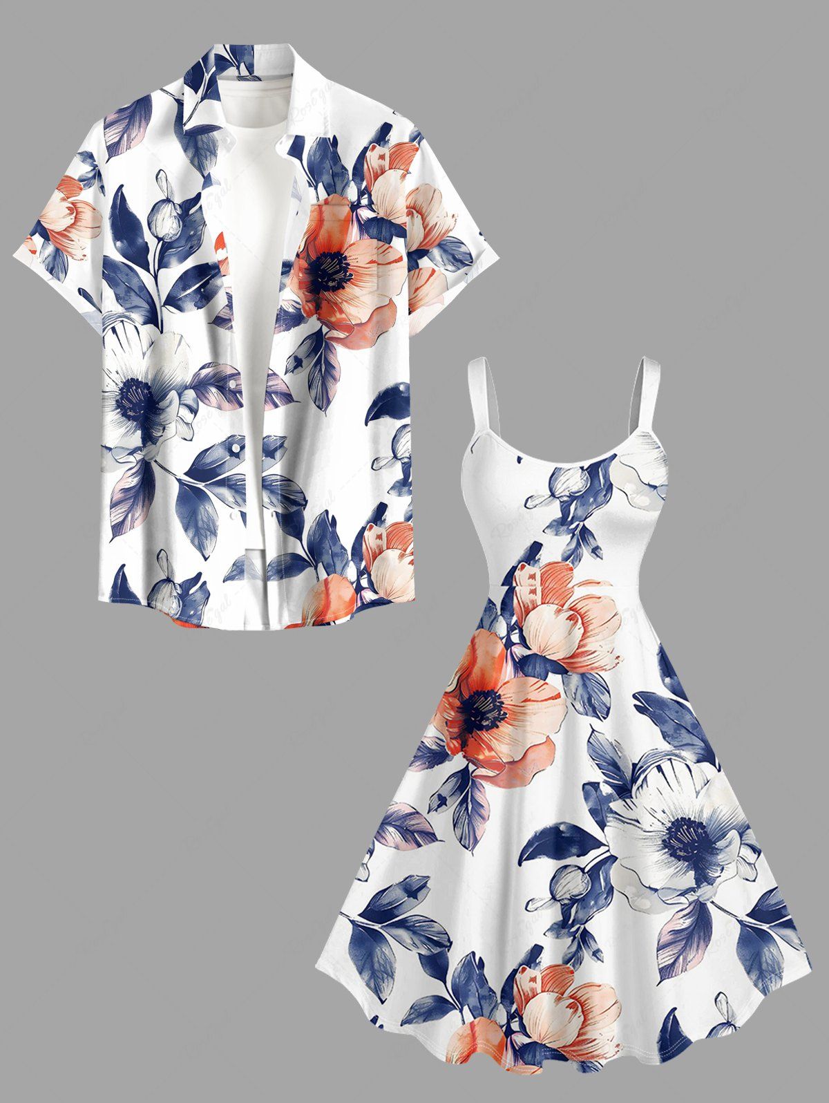 Flower Leaf Print Plus Size Matching Hawaii Beach Outfit For Couples