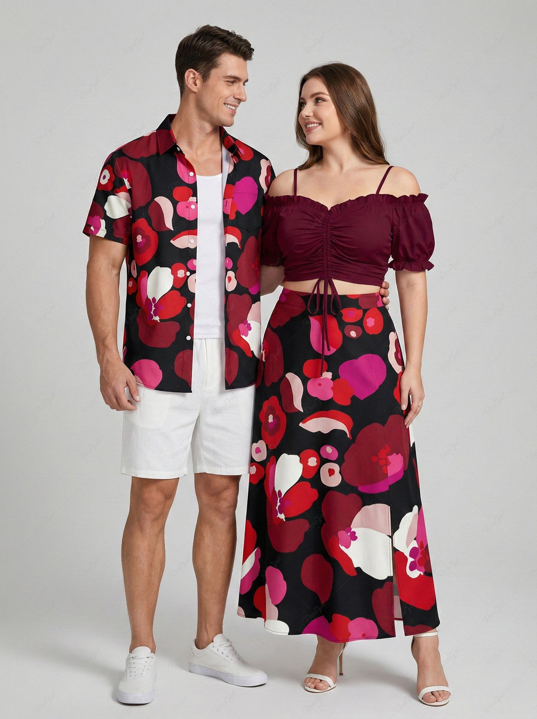 Flower Petal Heart Print Plus Size Matching Hawaii Beach Outfit For Couples