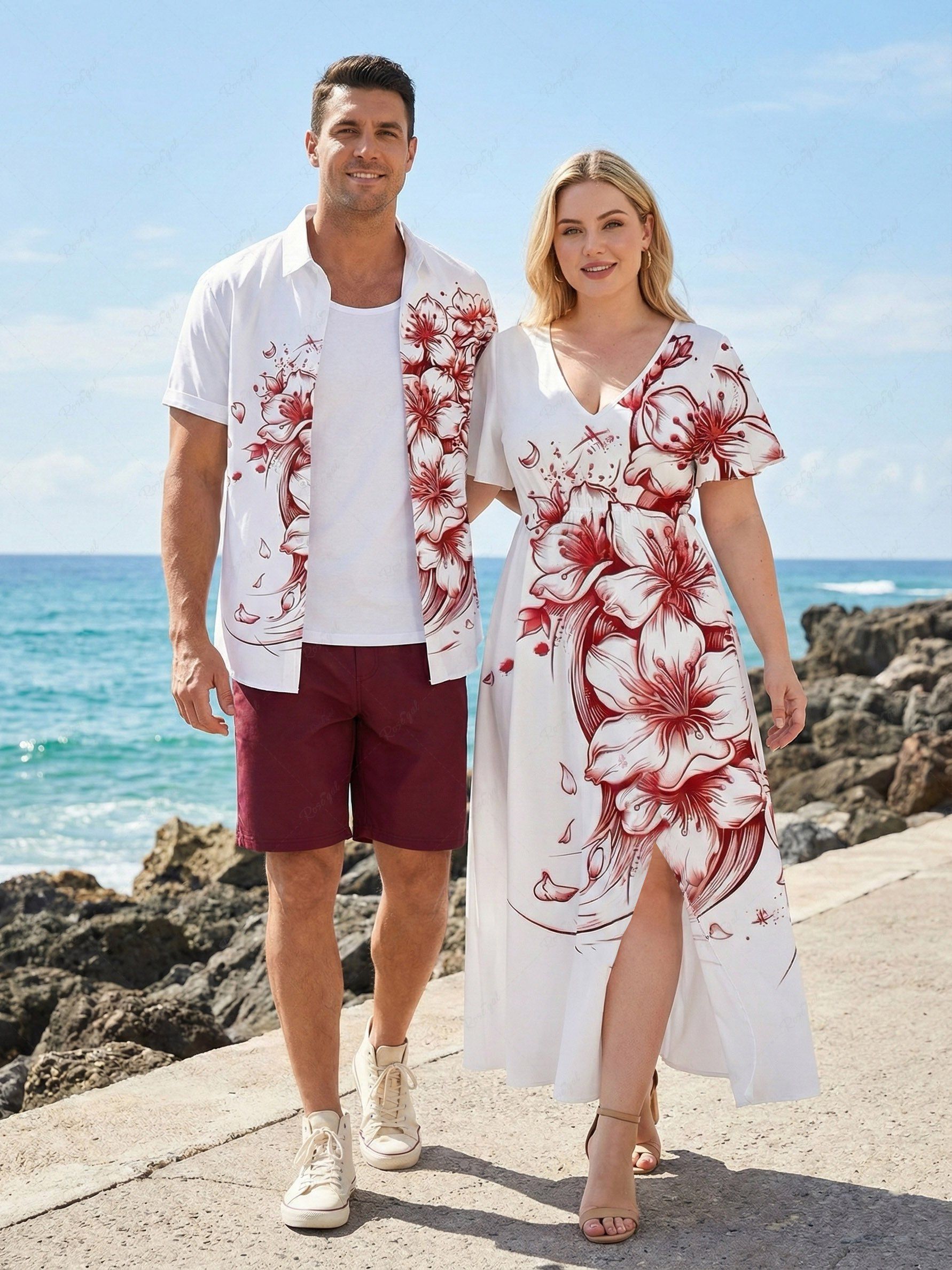 Flower Sea Waves Print Plus Size Matching Hawaii Beach Outfit For Couples