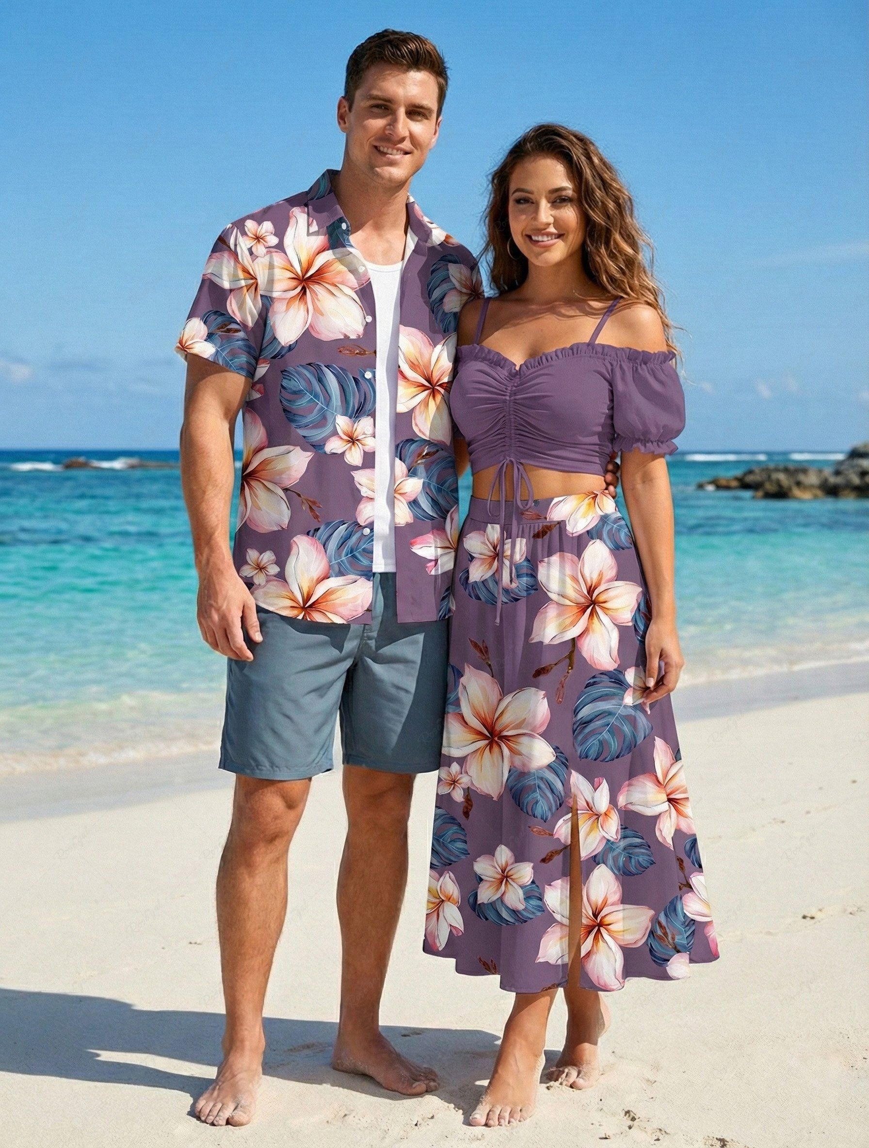 Flowers Leaf Print Plus Size Matching Hawaii Beach Outfit For Couples