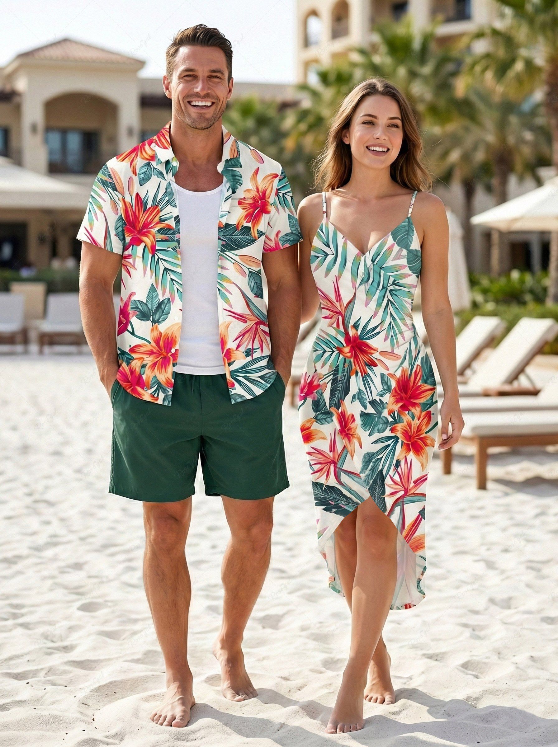 Flowers Leaf Tropical Print Plus Size Matching Hawaii Beach Outfit For Couples