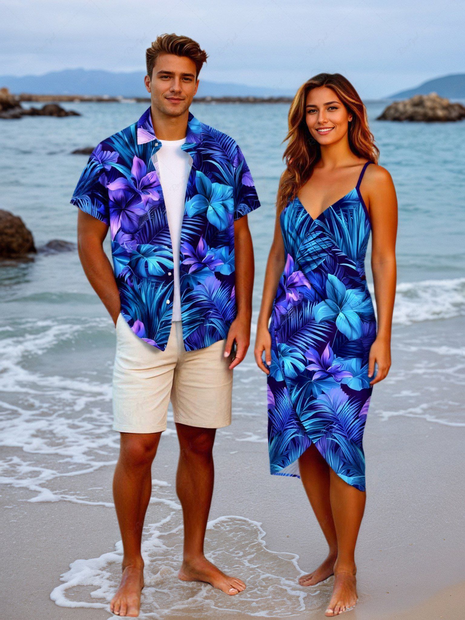 Flowers Tropical Leaf Print Plus Size Matching Hawaii Beach Outfit For Couples