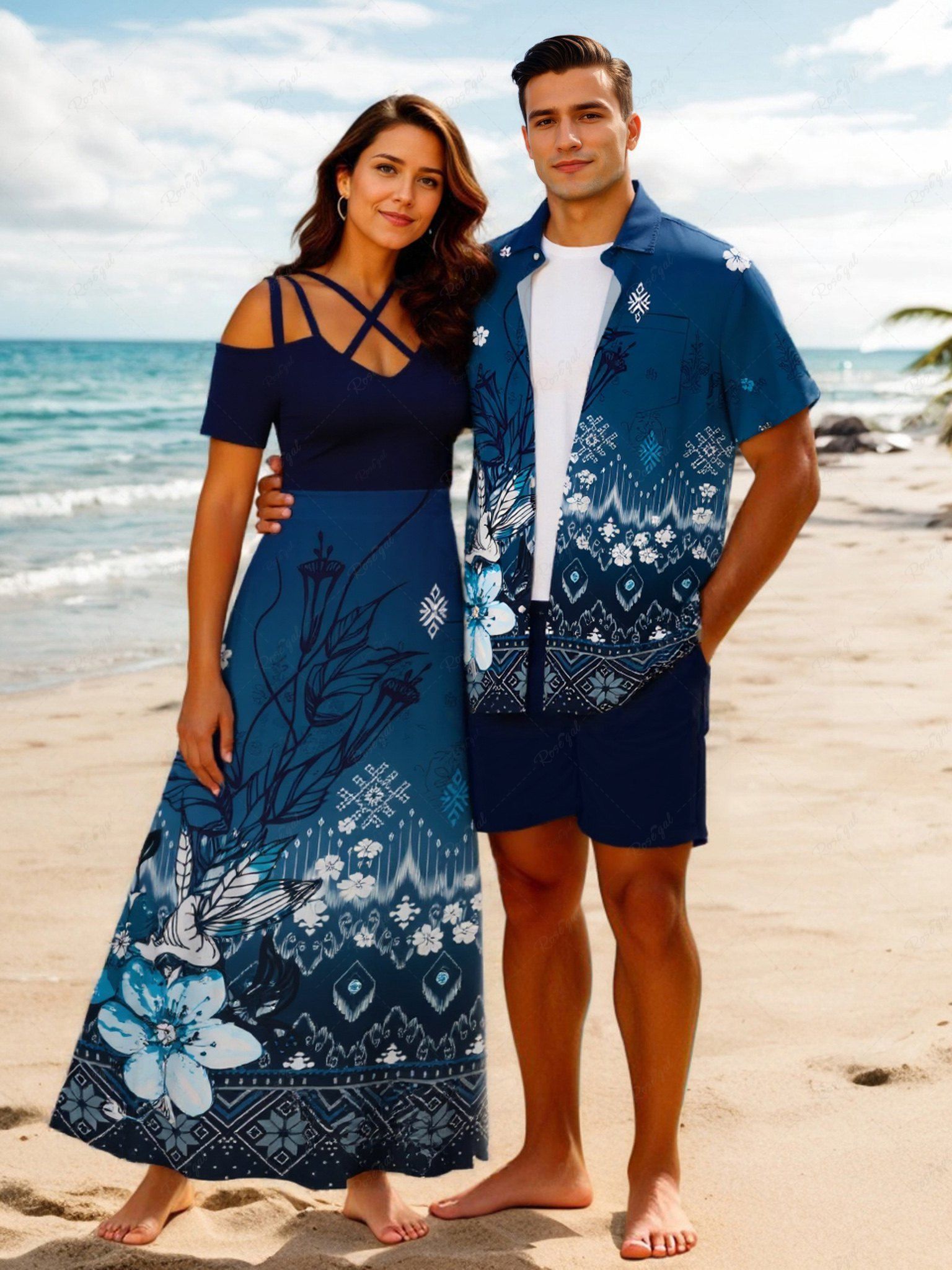 Hibiscus Flower Ethnic Graphic Print Plus Size Matching Hawaii Beach Outfit For Couples