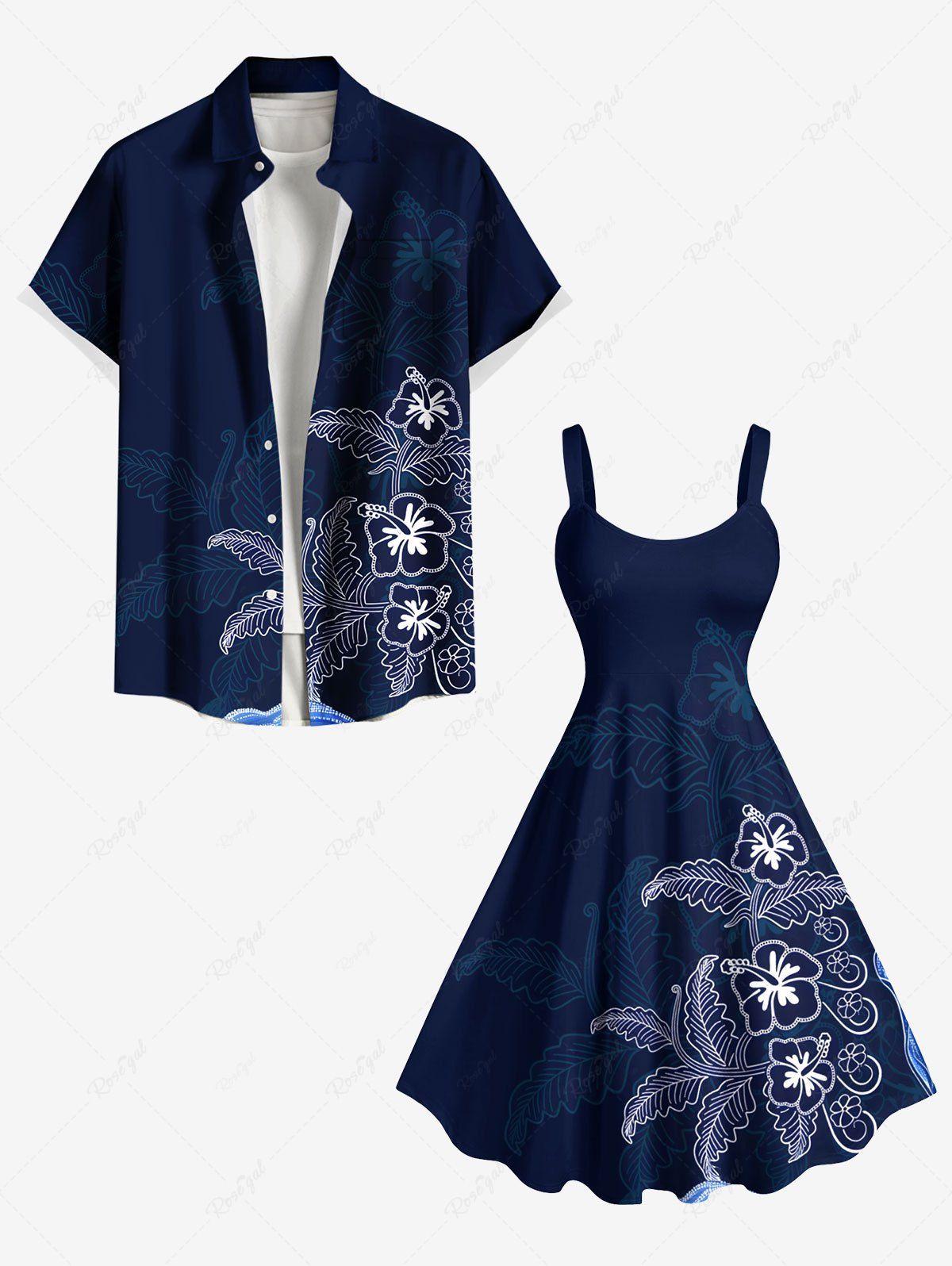 Hibiscus Flowers Leaf Print Plus Size Matching Hawaii Beach Outfit For Couples