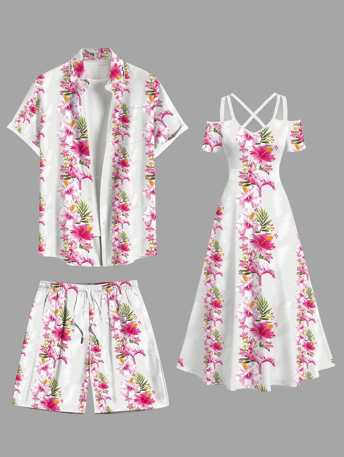 Hibiscus Flowers Tropical Leaf Flamingo Print Plus Size Matching Hawaii Beach Outfit For Couples