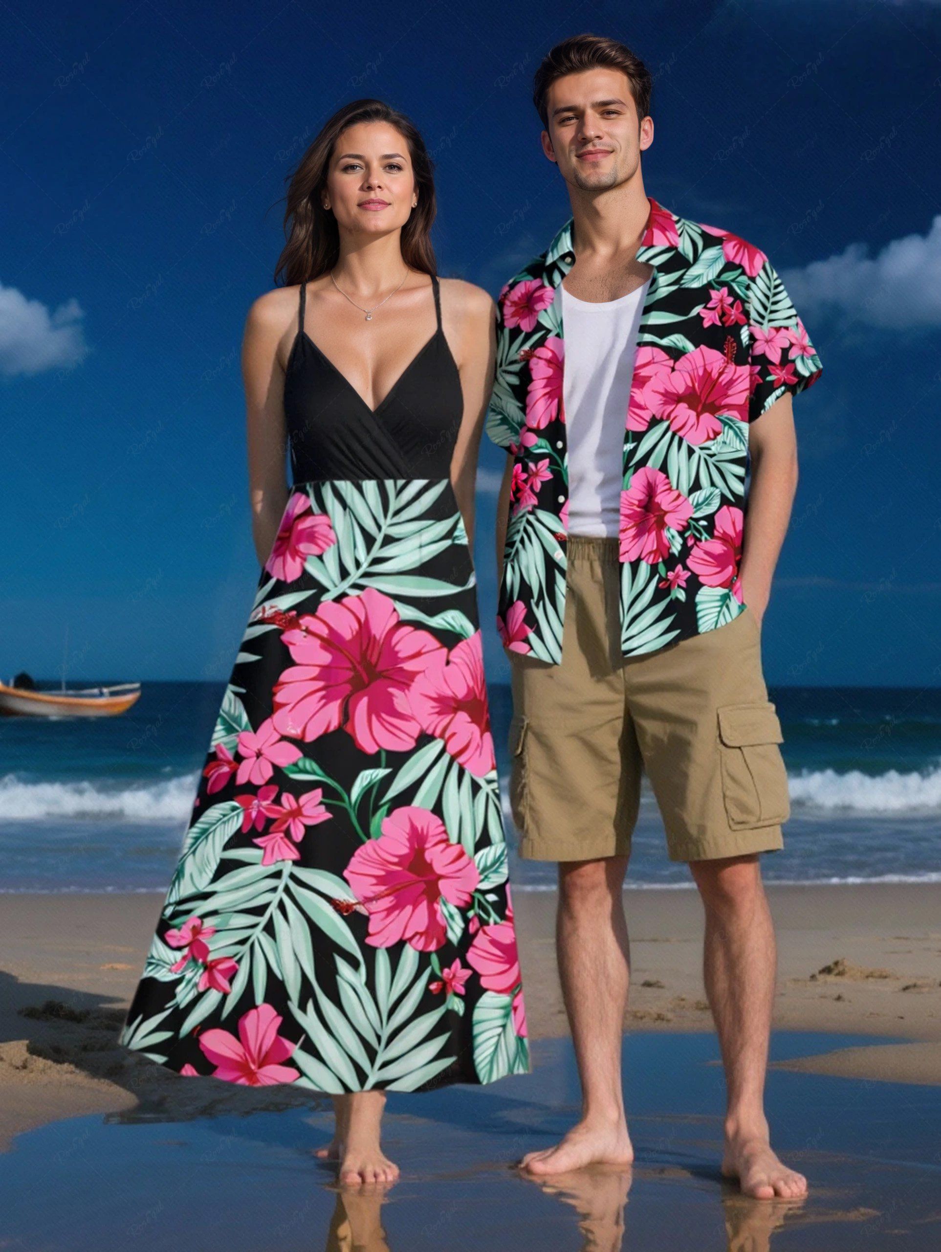Hibiscus Flowers Tropical Leaf Print Plus Size Matching Hawaii Beach Outfit For Couples
