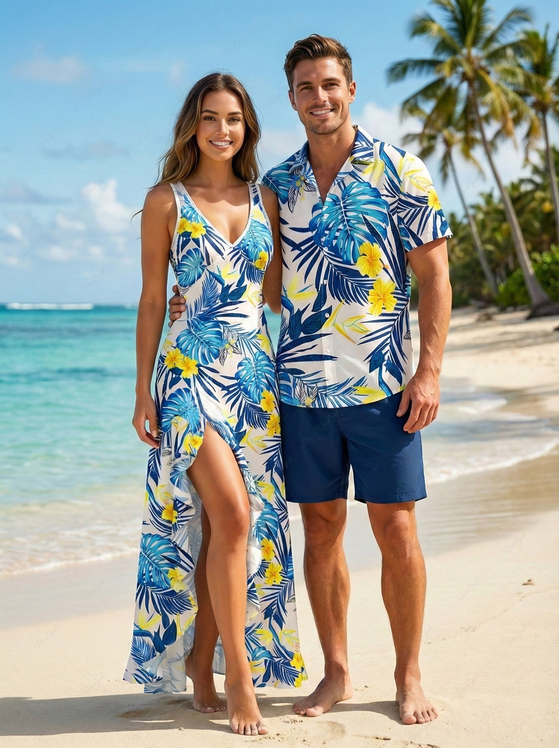 Hibiscus Flowers Tropical Leaf Print Plus Size Matching Hawaii Beach Outfit For Couples