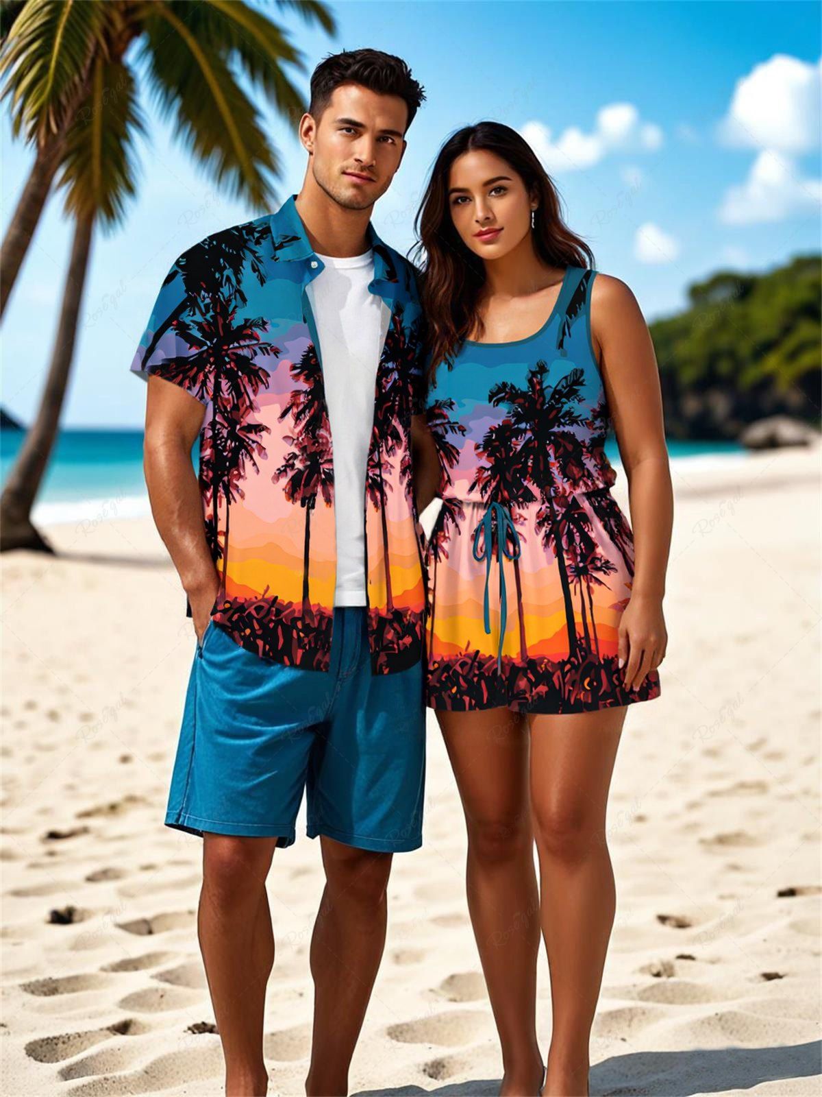 Matching Hawaii Shirt and Romper Plus Size Beach Outfit Coconut Tree Ombre Sky Oil Painting Printed for Couples