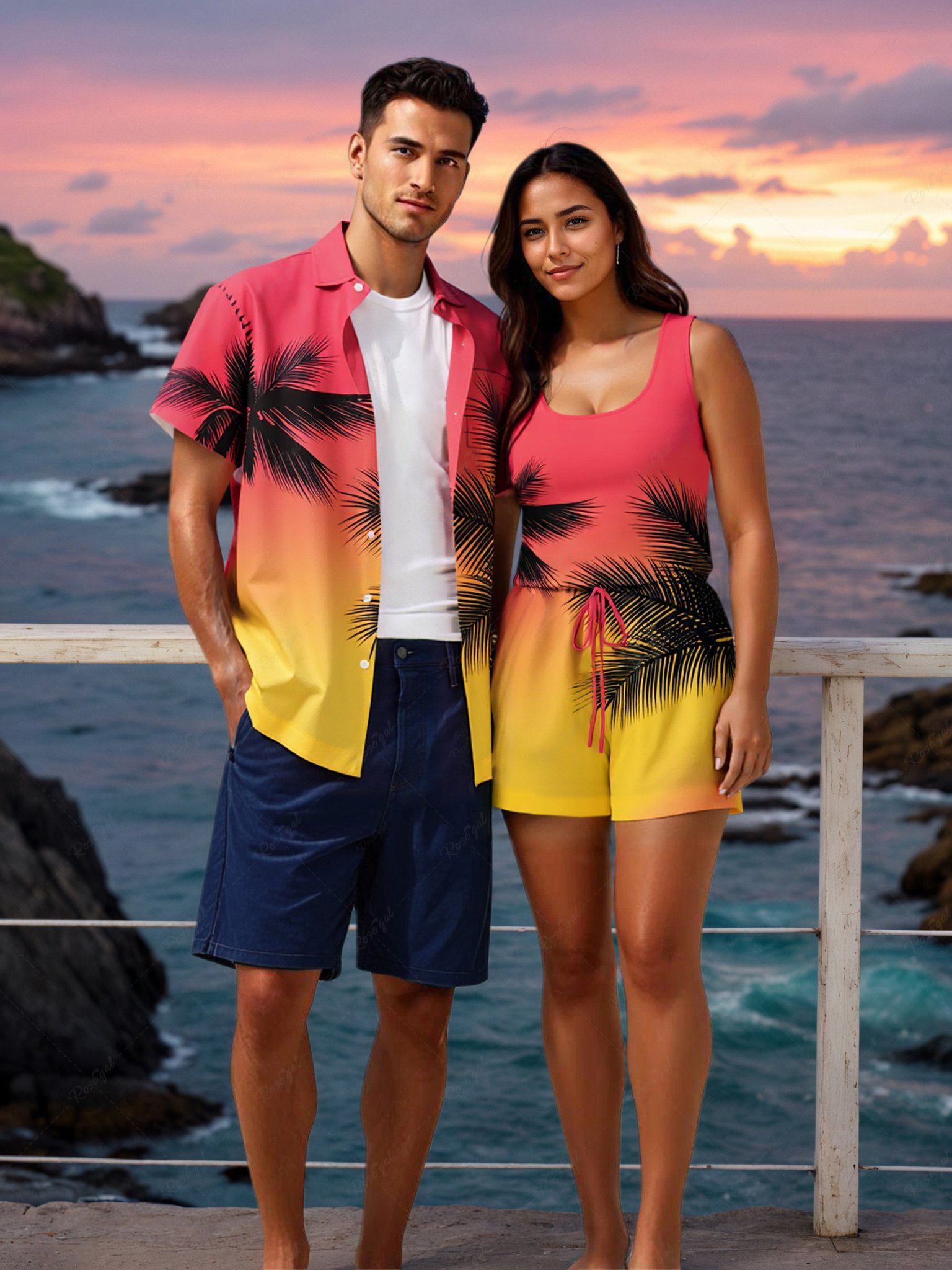 Matching Hawaii Shirt and Romper Plus Size Beach Outfit Coconut Tree Tropical Leaf Ombre Printed for Couples