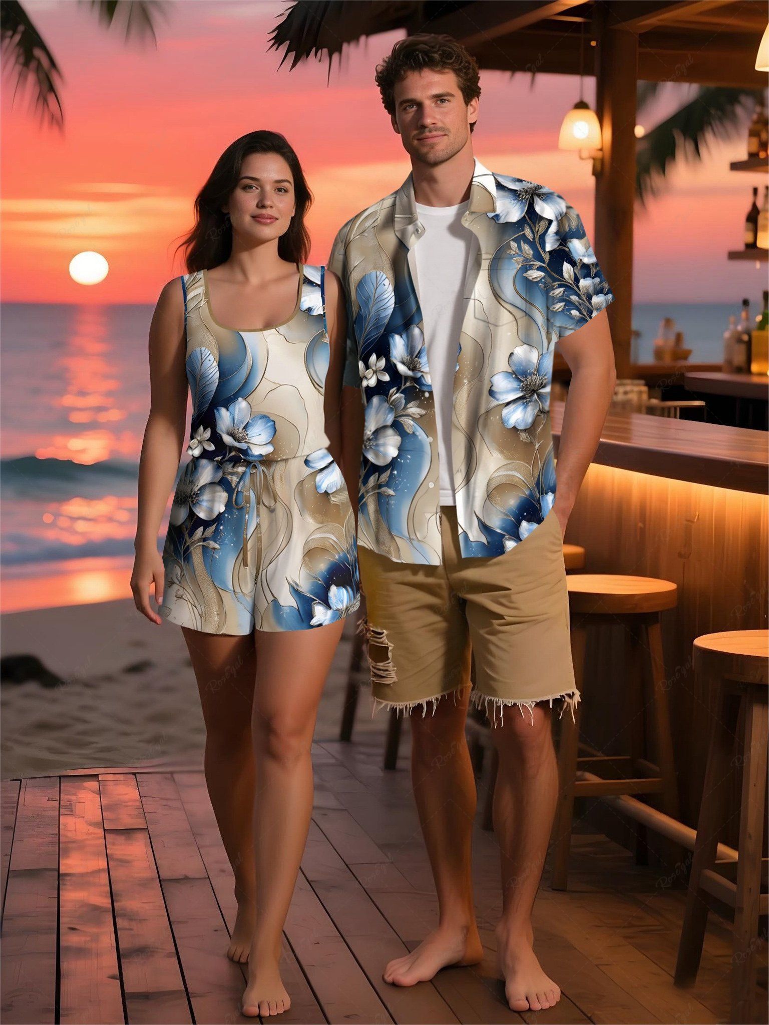 Matching Hawaii Shirt and Romper Plus Size Beach Outfit Flower Leaf Ombre Print For Couples