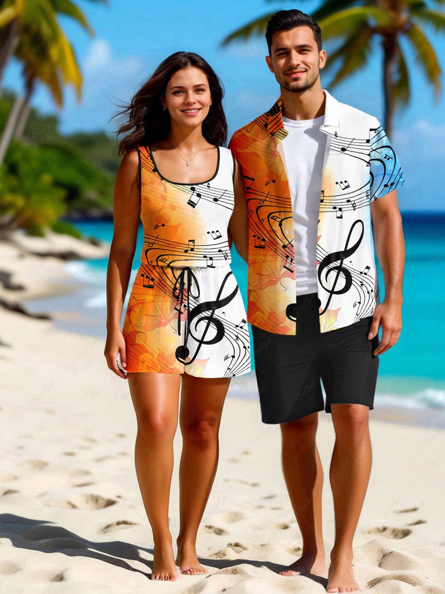 Matching Hawaii Shirt and Romper Plus Size Beach Outfit Ombre Leaf Music Symbol Print For Couples