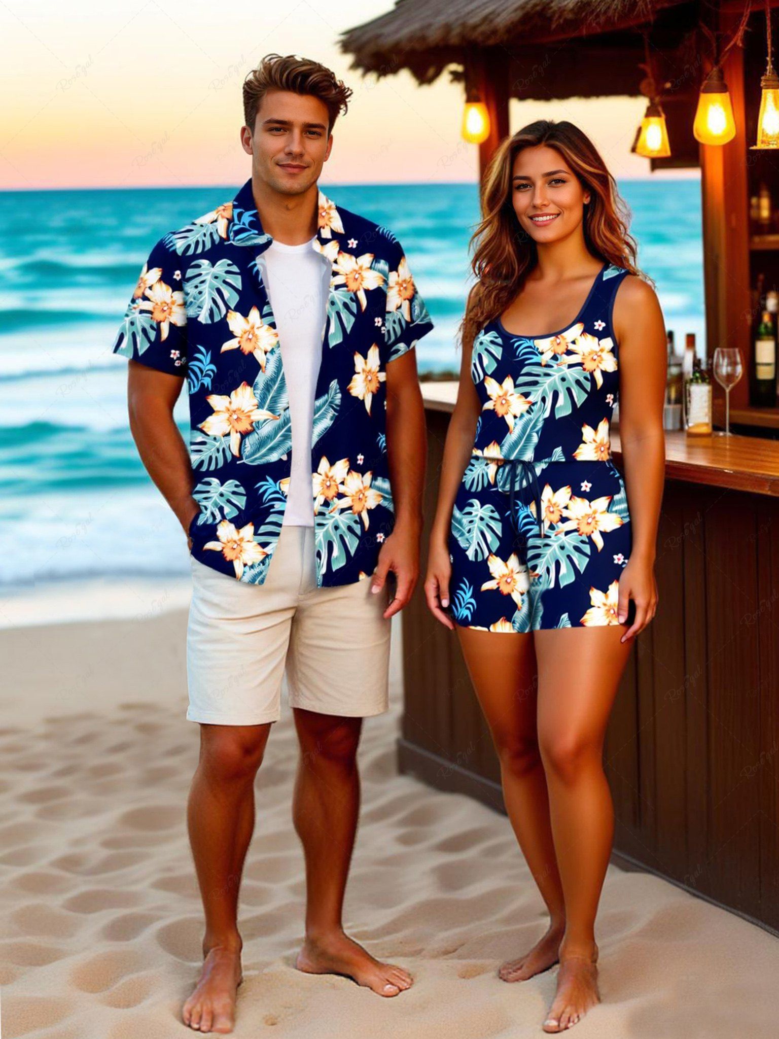 Matching Hawaii Shirt and Romper Plus Size Beach Outfit Tropical Leaf Hibiscus Flower Print For Couples