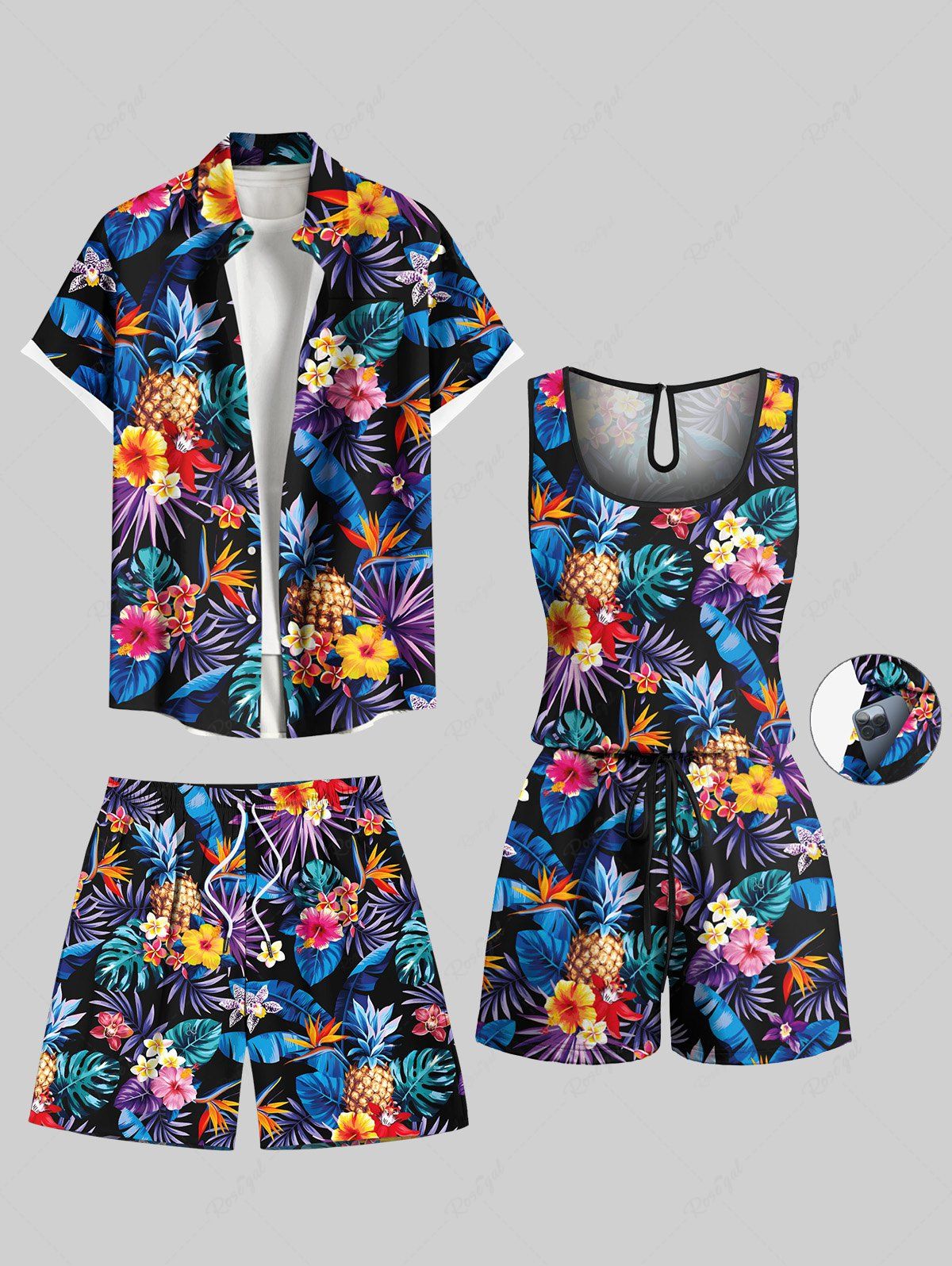 Matching Hawaii Shirt and Romper Plus Size Beach Outfit Tropical Leaf Hibiscus Printed for Couples