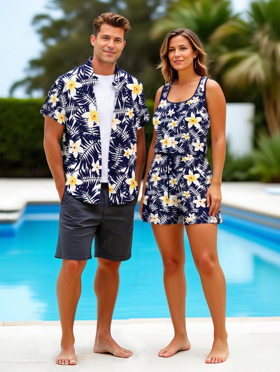 Matching Hawaii Shirt and Romper Plus Size Beach Outfit Tropical Leaf Hibiscus Printed for Couples