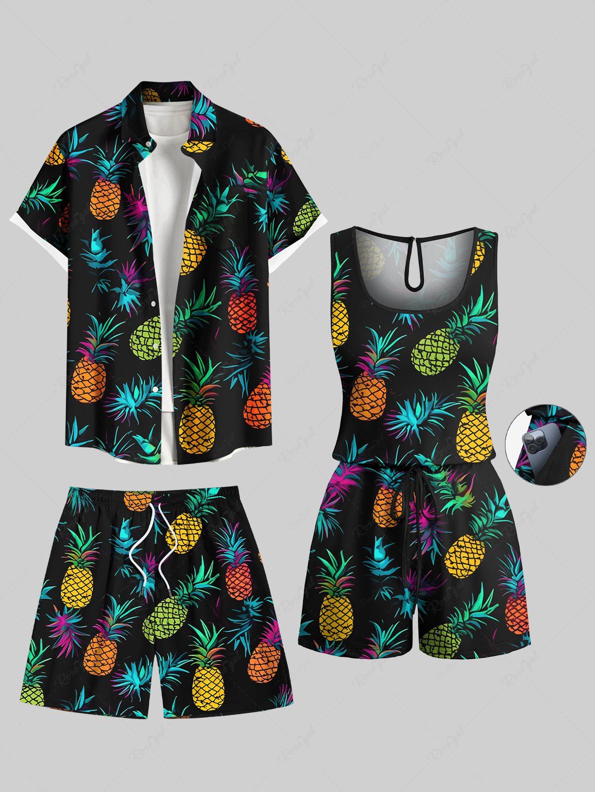Matching Hawaii Shirt Short and Romper Plus Size Beach Outfit Colorful Pineapple Print For Couples