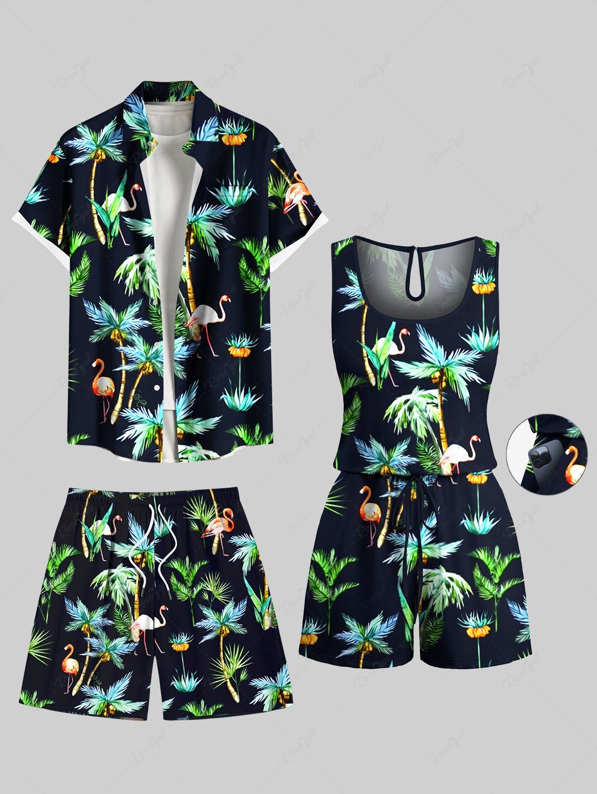 Matching Hawaii Shirt Shorts and Romper Plus Size Beach Outfit Coconut Tree Flamingo Print For Couples