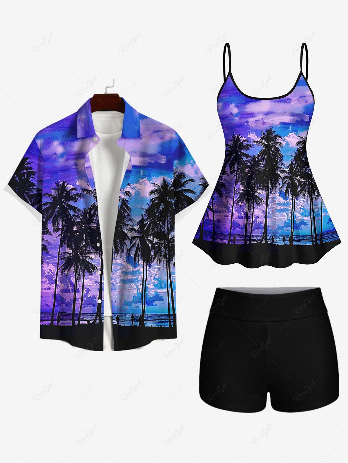 Men's Coconut Tree Cloud Sea Print Buttons Pocket Shirt and Boyleg Tankini Swimsuit Plus Size Matching Hawaii Beach Outfit For Couples