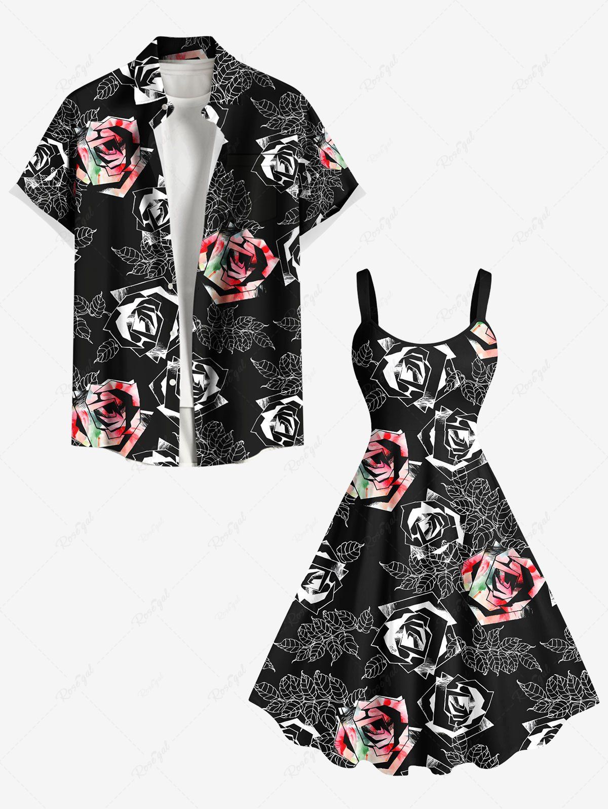 Ombre Rose Flower Leaves Branch Print Plus Size Matching Hawaii Beach Outfit For Couples