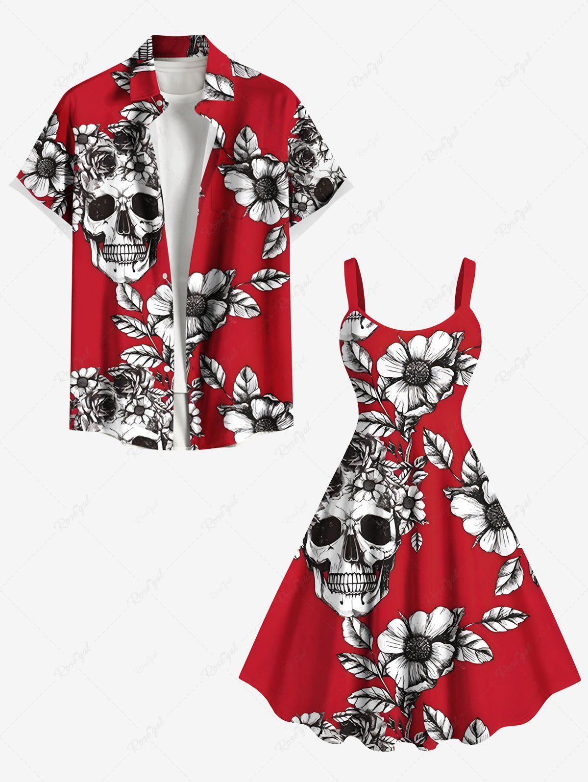 Skulls Flowers Leaf Print Plus Size Matching Hawaii Beach Outfit For Couples