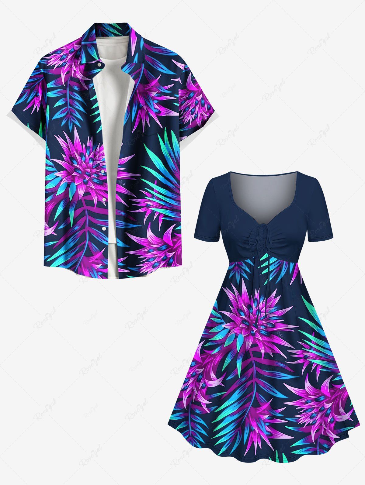 Sea Flower Car Coconut Tree Print Cinched Dress and Button Pocket Shirt Plus Size Matching Hawaii Beach Outfit