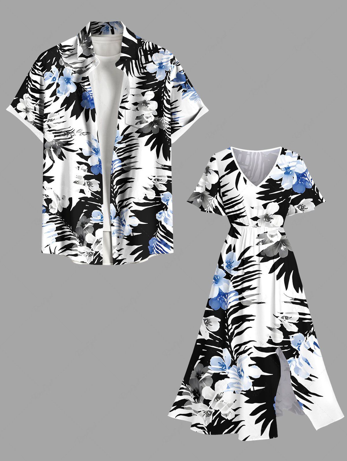 Tropical Leaf Flower Print Plus Size Matching Hawaii Beach Outfit For Couples