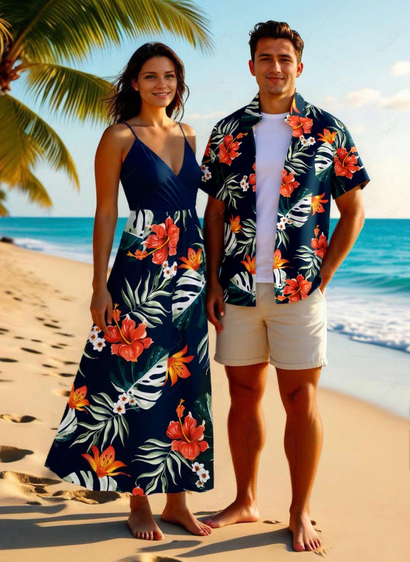 Tropical Leaf Hibiscus Flower Print Plus Size Matching Hawaii Beach Outfit For Couples