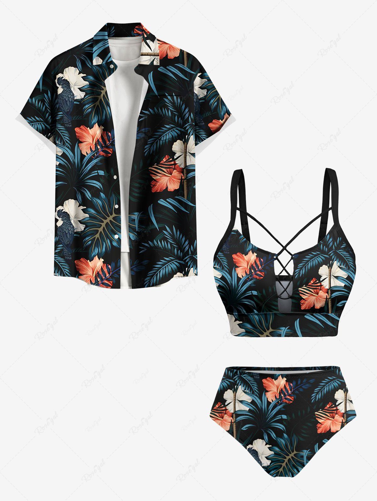 Tropical Leaf Hibiscus Flower Print Shirt Swimsuit Plus Size Matching Hawaii Beach Outfit For Couples