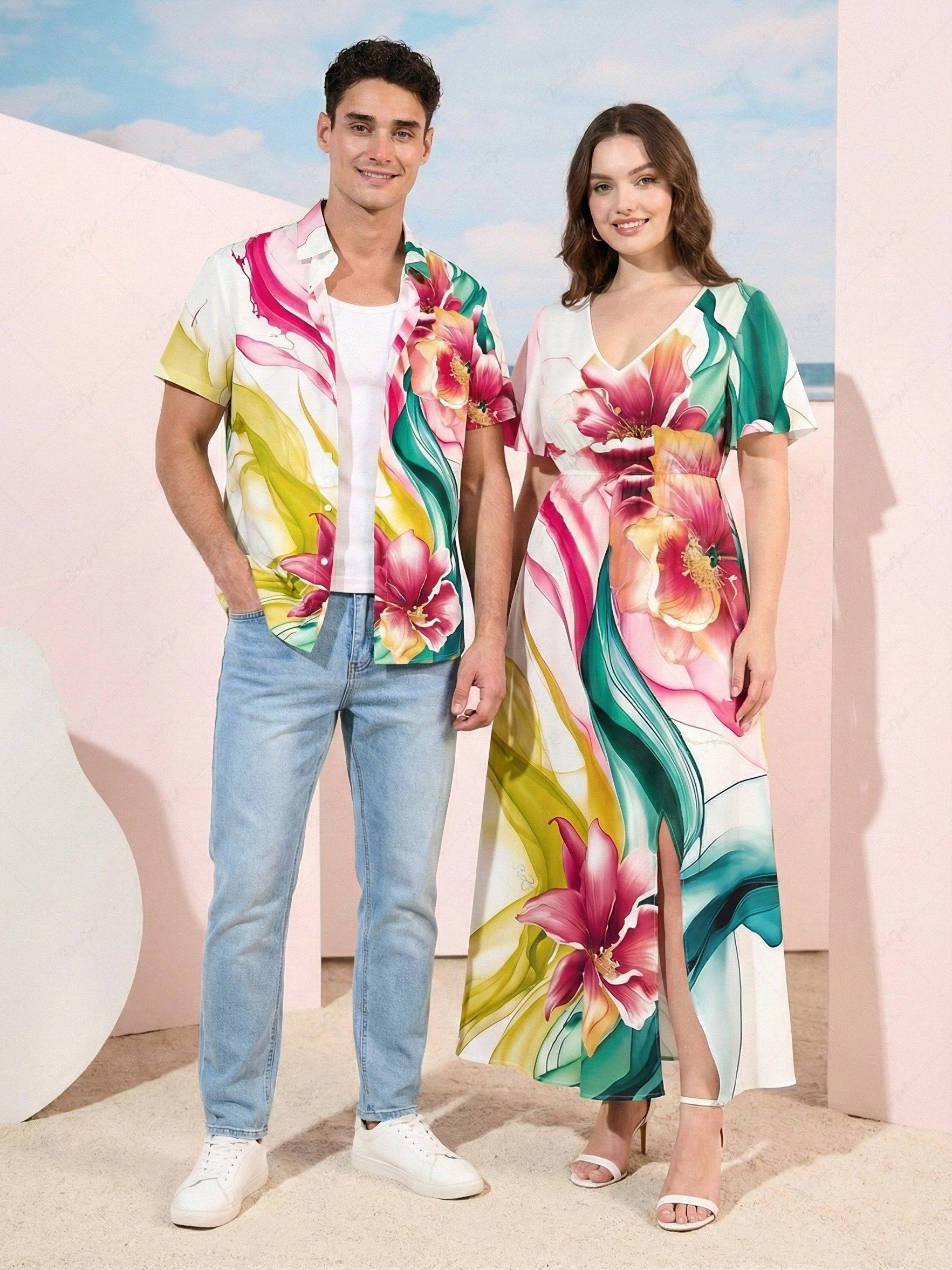 Watercolor Ribbon Flower Print Plus Size Matching Hawaii Beach Outfit For Couples