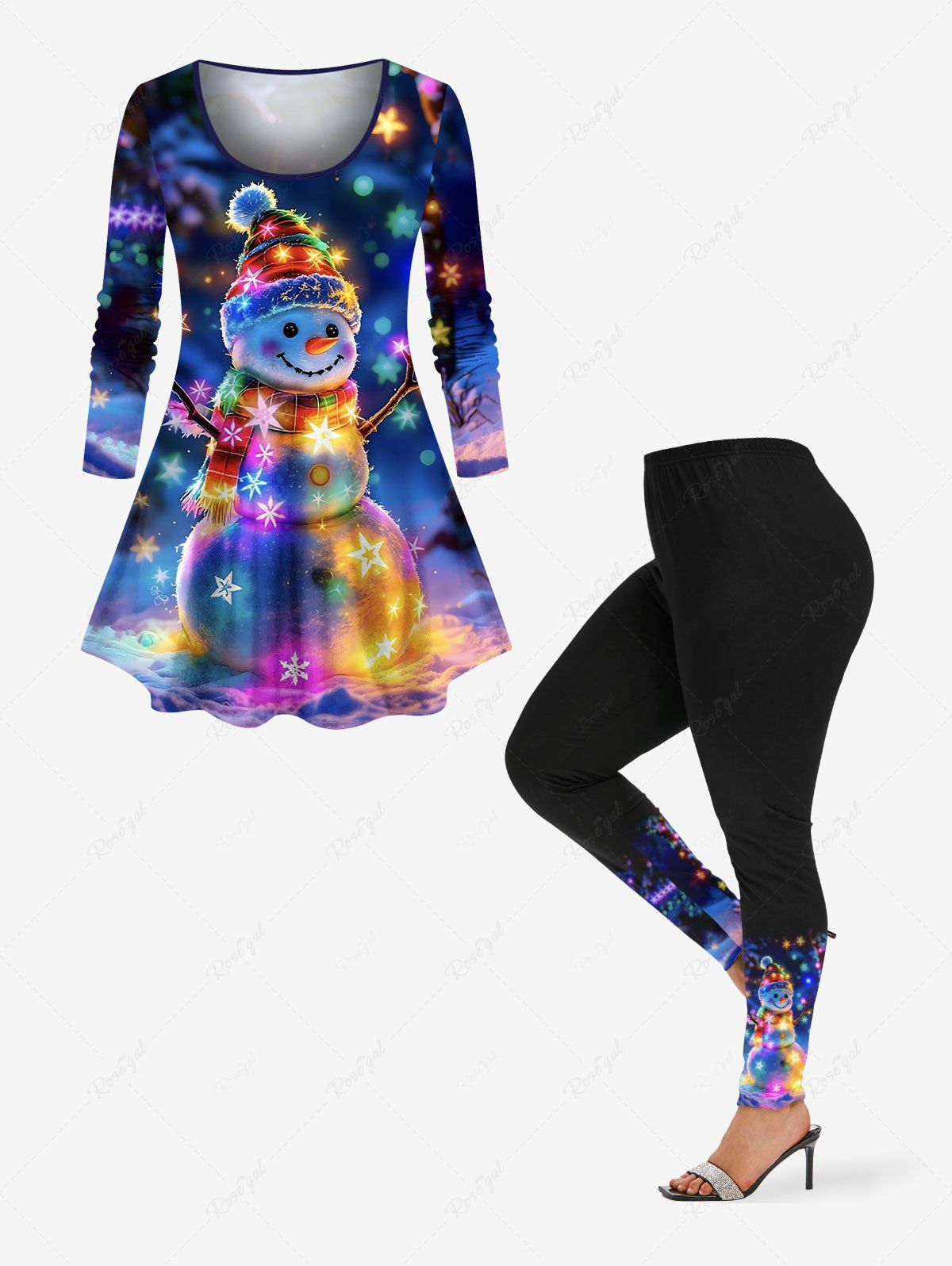 Colorful Glitter Ombre Christmas Light Snowman Print Long Sleeves Women T-shirt and Leggings Plus Size Matching Set