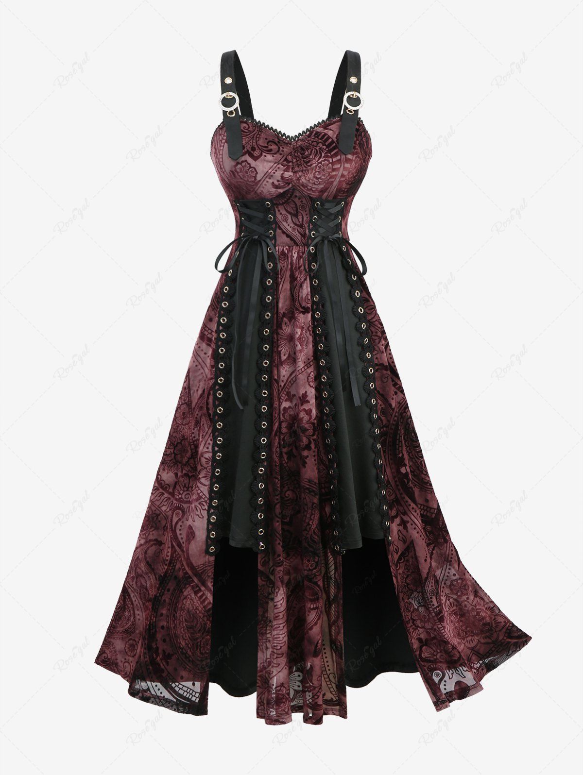 Flower Paisley Flocking Tie Dye Print Mesh Grommets Lace-up Ruchd Lace Trim Tank Dress - M