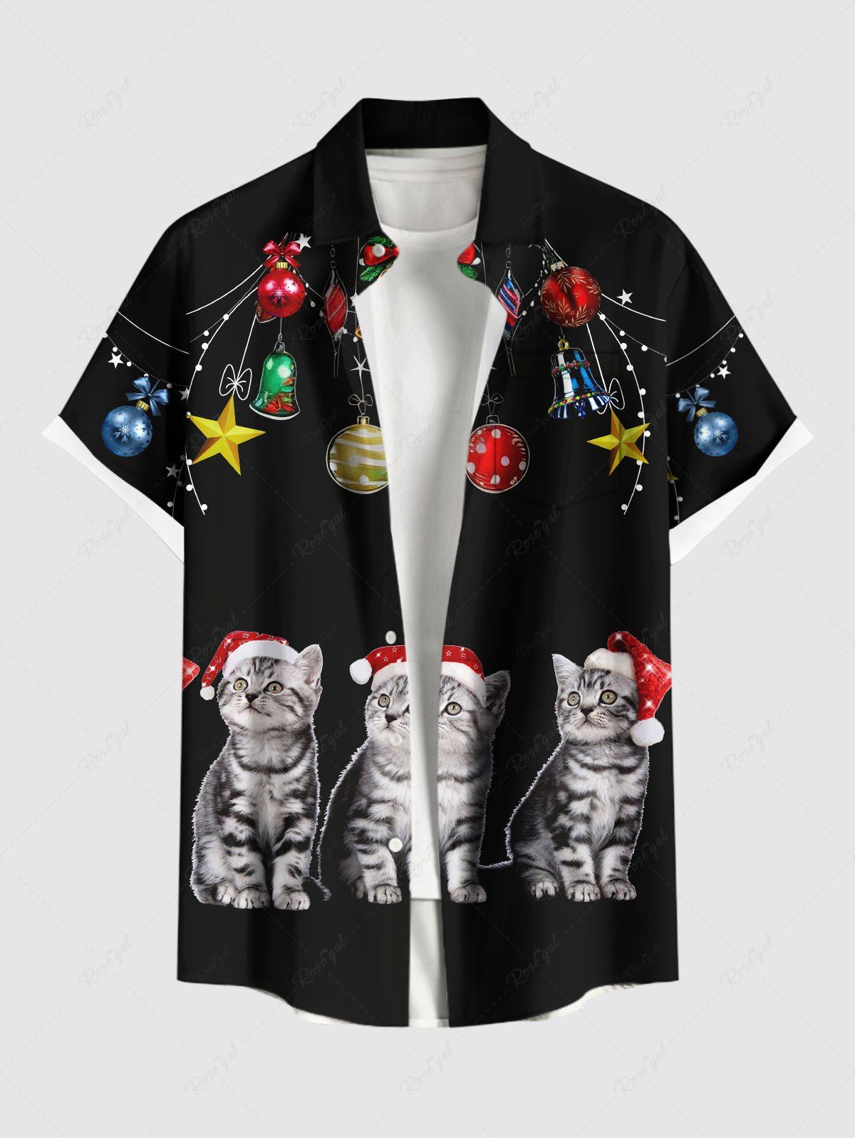 Plus Size Christmas Ball Bell Star Hat Cats Print Buttons Pocket Shirt For Men - 4xl