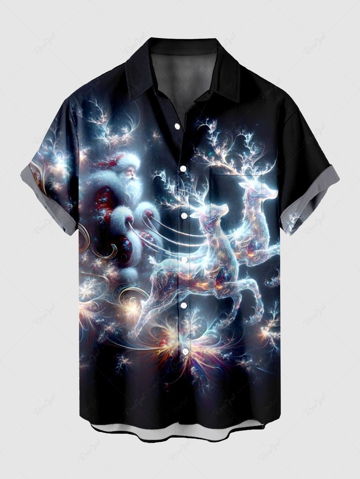 Plus Size Christmas Elk Santa Claus Glitter Galaxy Print Buttons Pocket Shirt For Men - Xl