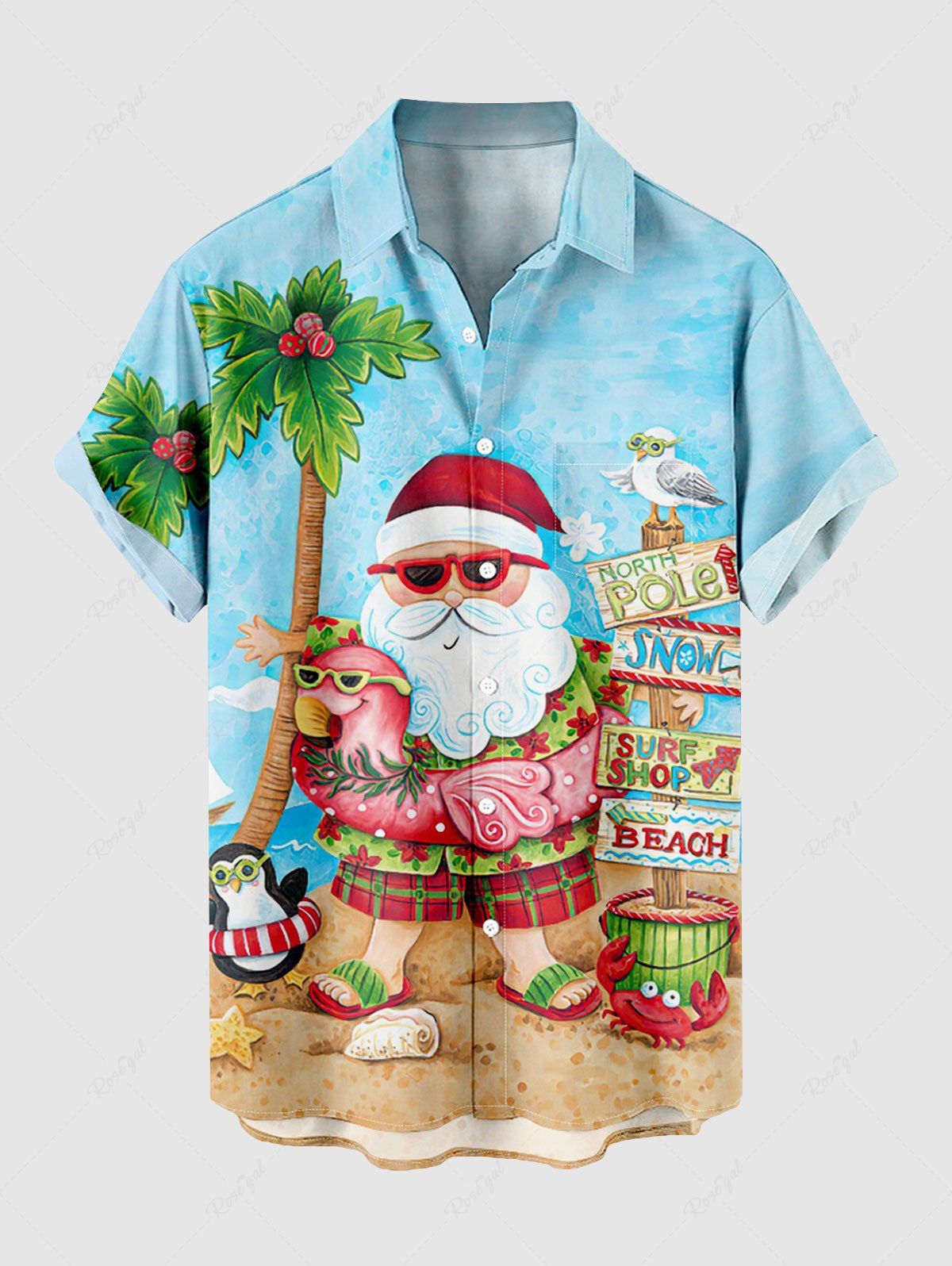 Plus Size Christmas Santa Claus Coconut Tree Flamingo Seascape Print Buttons Pocket Shirt For Men - Xl