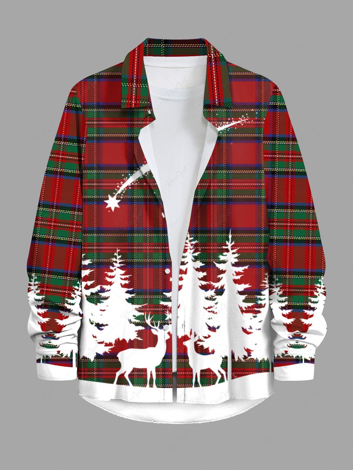 Plus Size Christmas Tree Elk Plaid Print Button Long Sleeves Shirt For Men - 2xl