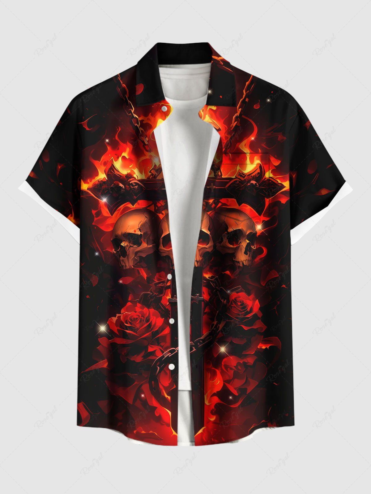 Plus Size Halloween Skulls Fire Flame Rose Flower Cross Print Buttons Pocket Shirt For Men - Xl