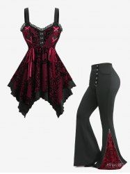 Floral Printed Lace-up Off The Shoulder Top and Skull Mesh Flocking Appliques Flare Pants Plus Size Outfit