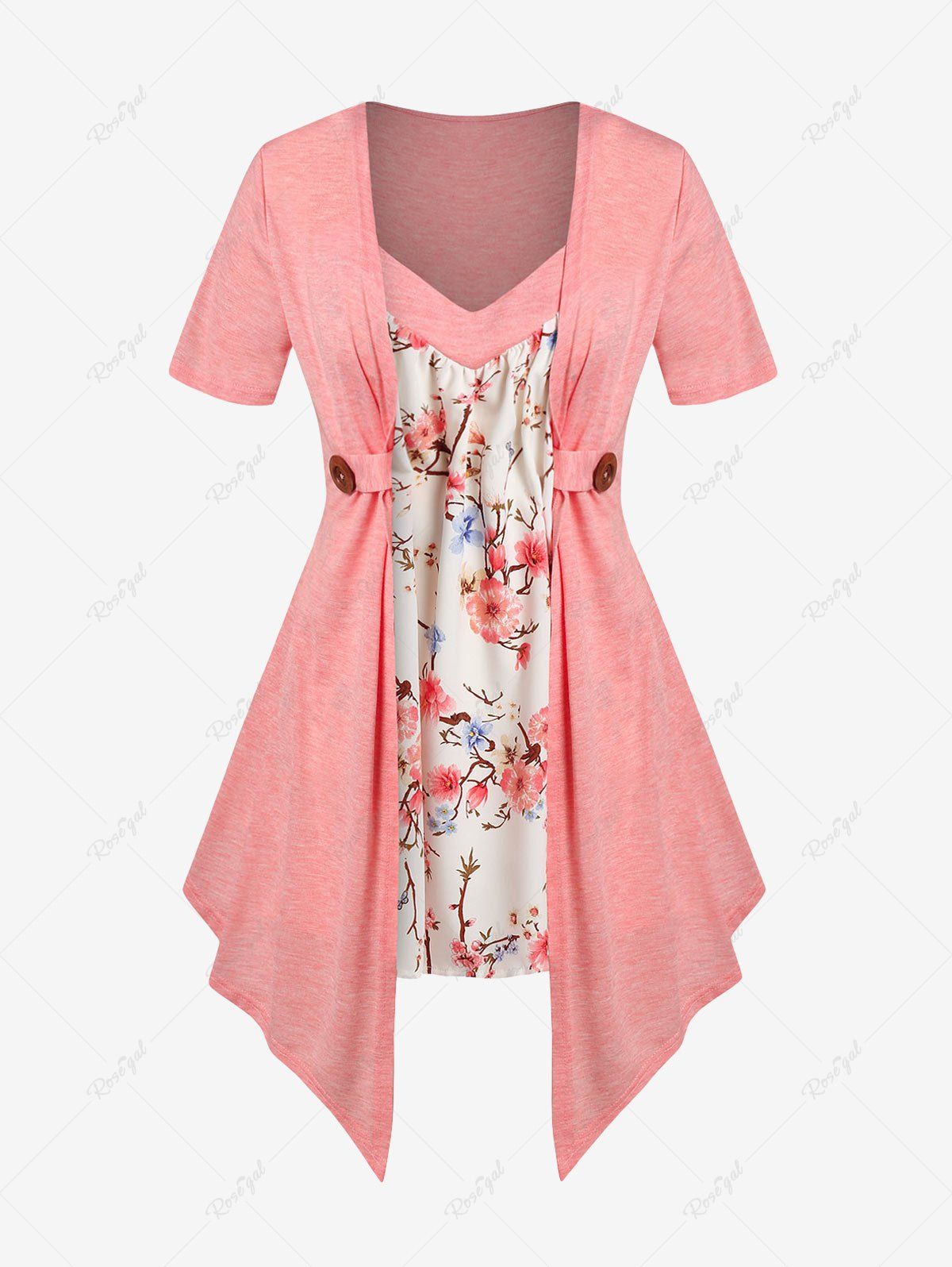 Plus Size Rose Flower Print Ruched Ruffles Tulip Hem Buckle Surplice 2 In 1 Top