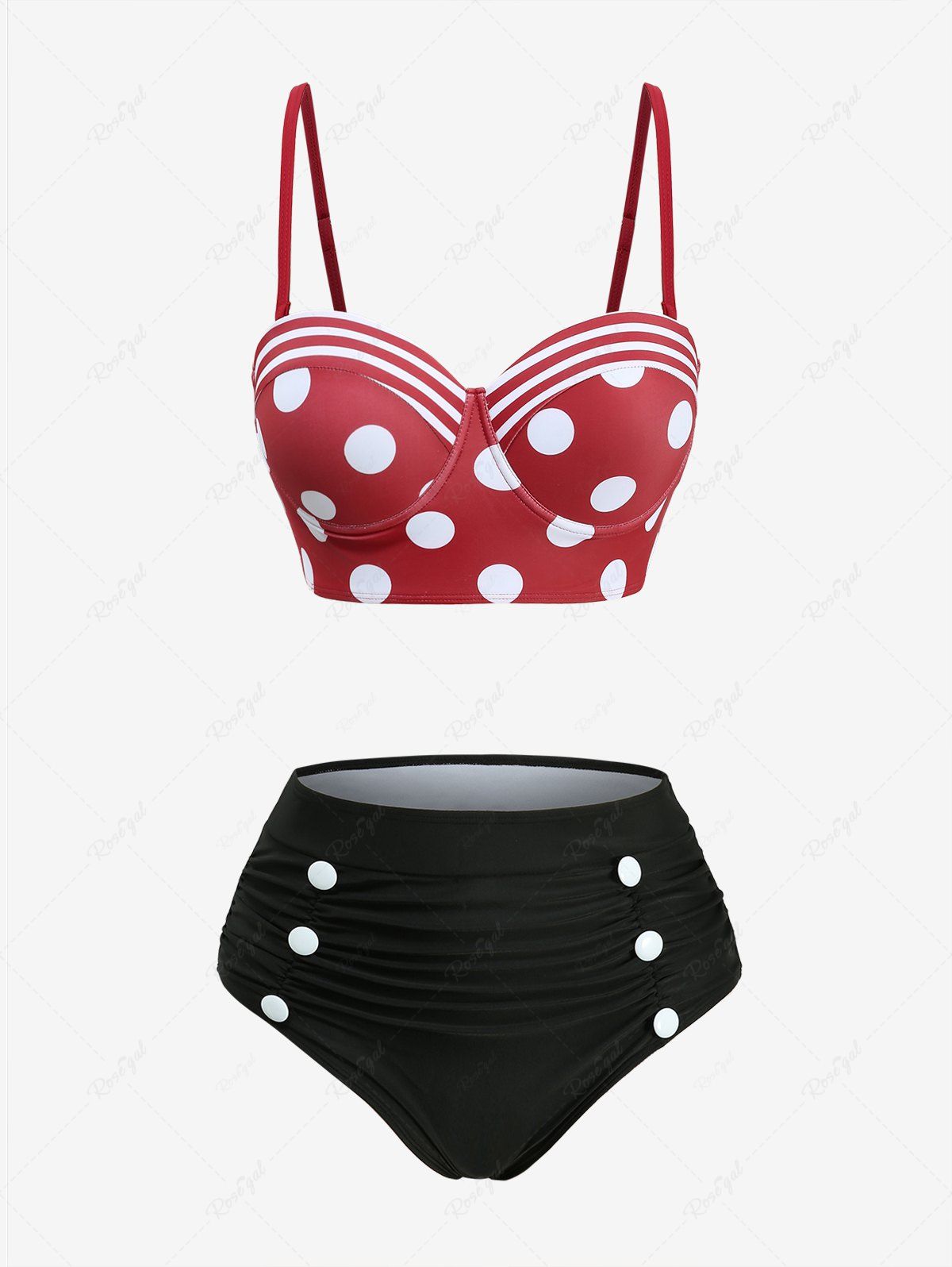 Plus Size Polka Dot Striped Print Ruched Button Tankini Swimsuit (Adjustable Shoulder Strap) - 2x | Us 18-20