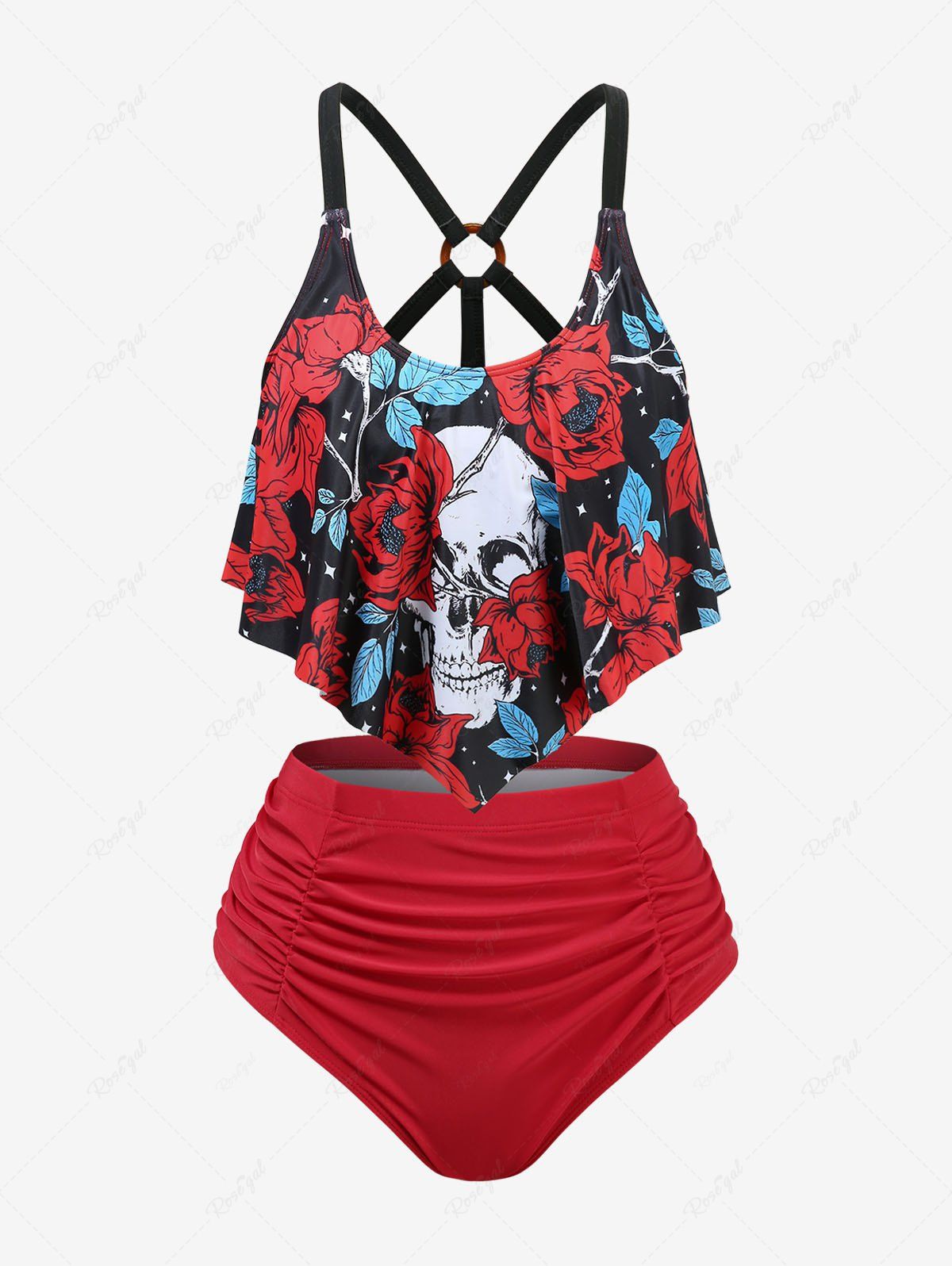 Plus Size Skull Flowers Print Crisscross Straps Ruched Bottom Tankini Swimsuit - 2x | Us 18-20