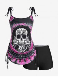 Plus Size Skull Rose Tie Dye Print Cinched Ruched Tie Boyshorts Tankini Swimsuit - 3x | Us 22-24