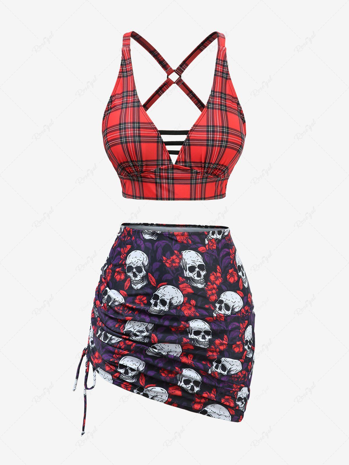 Plus Size & Curve Halter Plaid Skull Print Backless Gothic Modest Tankini Swimsuit