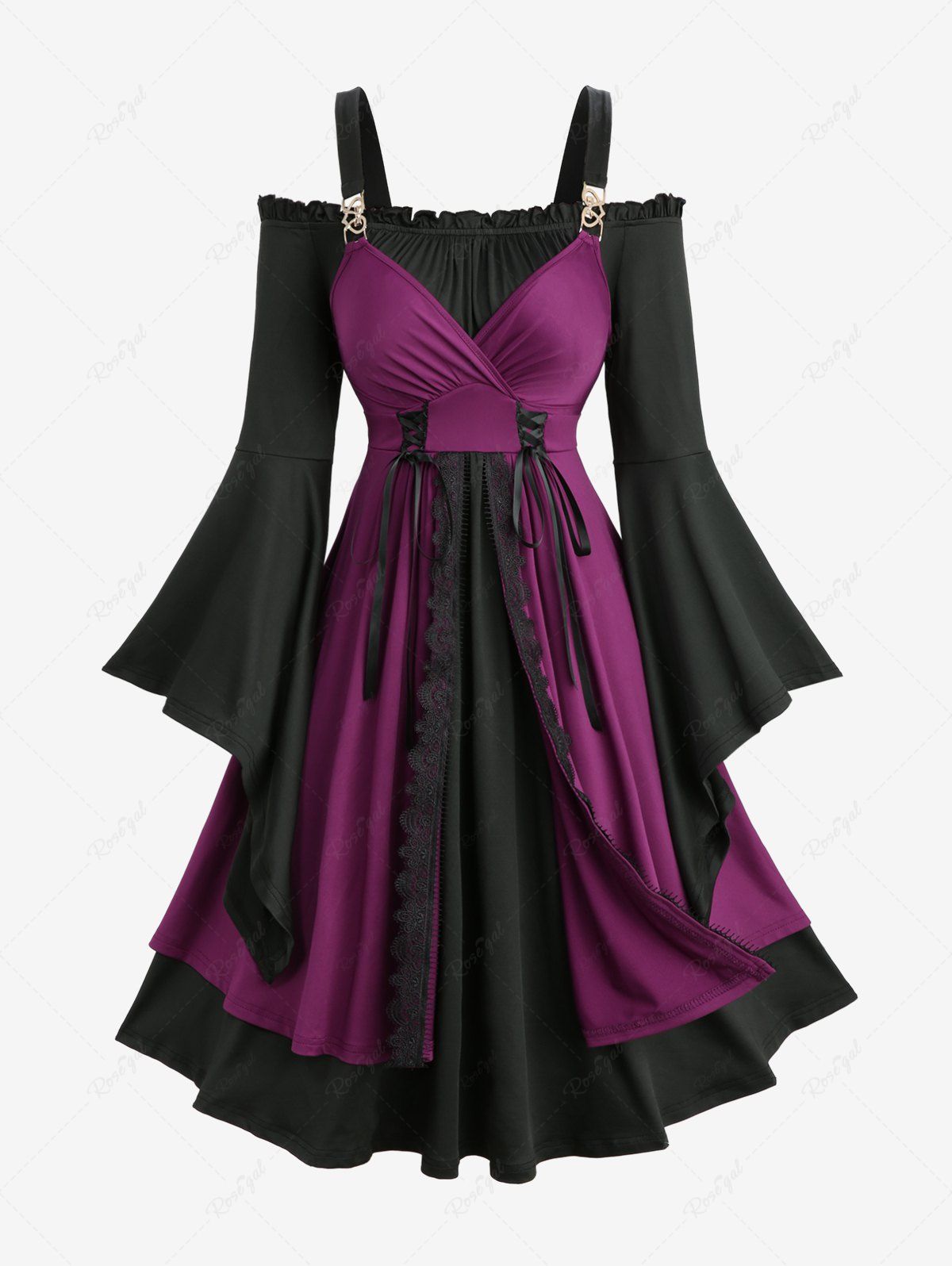 Plus Size Flare Sleeve Lace-up Lace Trim Two Tone Layered Vintage A Line Dress - 3x | Us 22-24