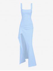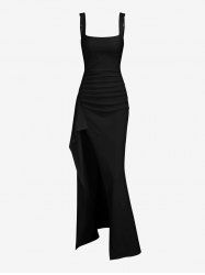 Women's Sexy Elegant Solid Color Backless Ruched Draped Thigh High Split Square Neck Adjustable Shoulder Straps Party Evening Gown Maxi Dress - M