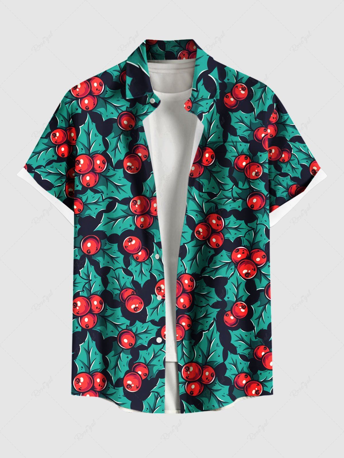 Plus Size Christmas Holly Fruit Leaf Print Buttons Pocket Shirt For Men - 6xl