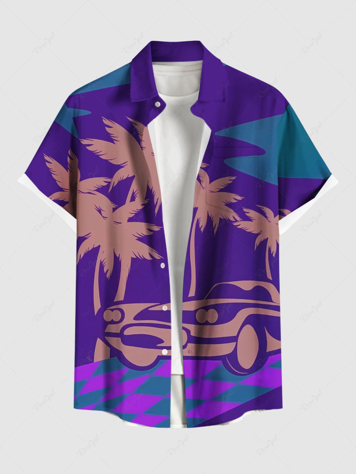 Plus Size Coconut Tree Car Geometric Colorblock Print Hawaii Button Pocket Shirt For Men - L